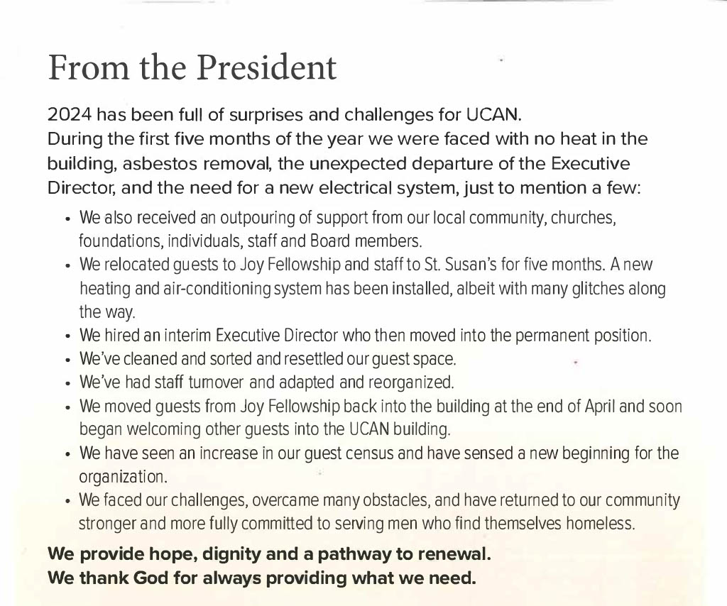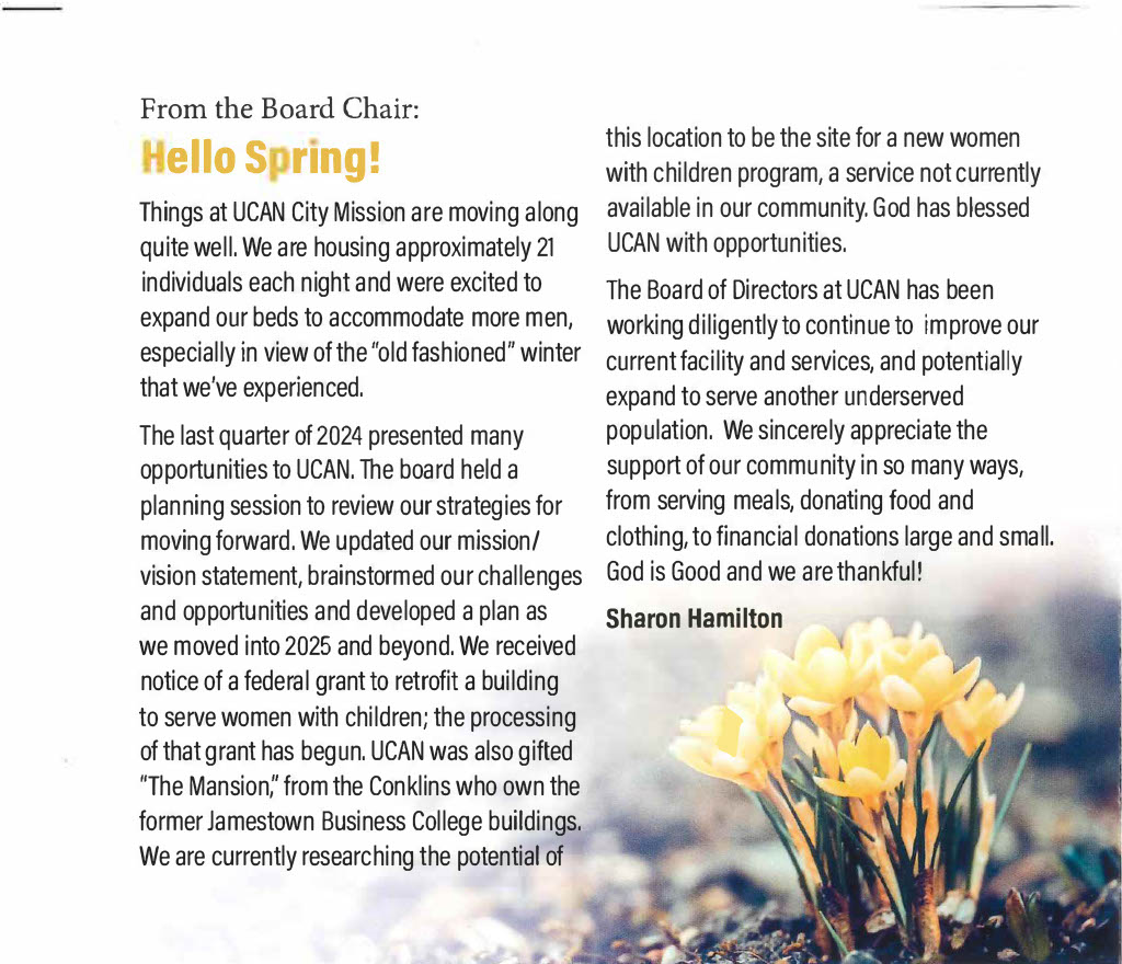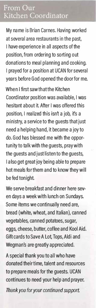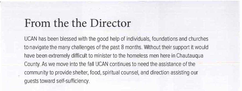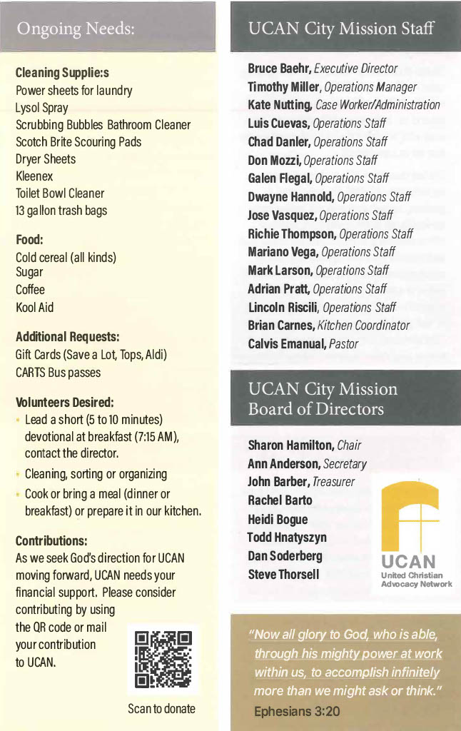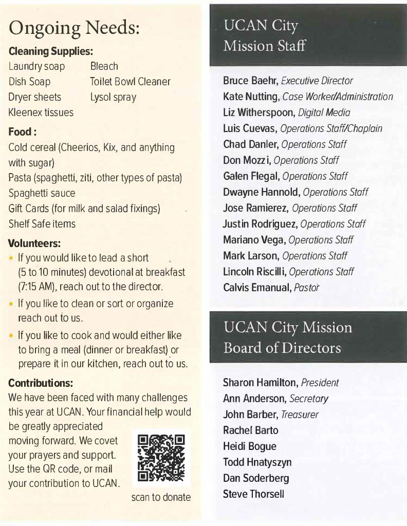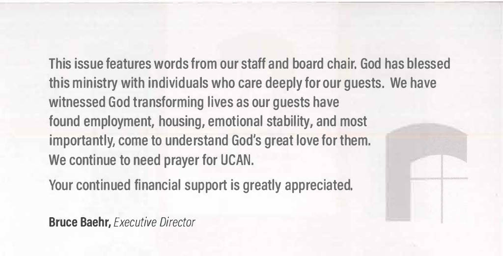 Another season and many things have been slowly transitioning here at The UCAN City Mission. Please check out our latest’s newsletters that have been posted. As we take a look at the new season we are walking through right now and what can be expected for the future. We can not help but be excited about the newness of life and vision at UCAN.
