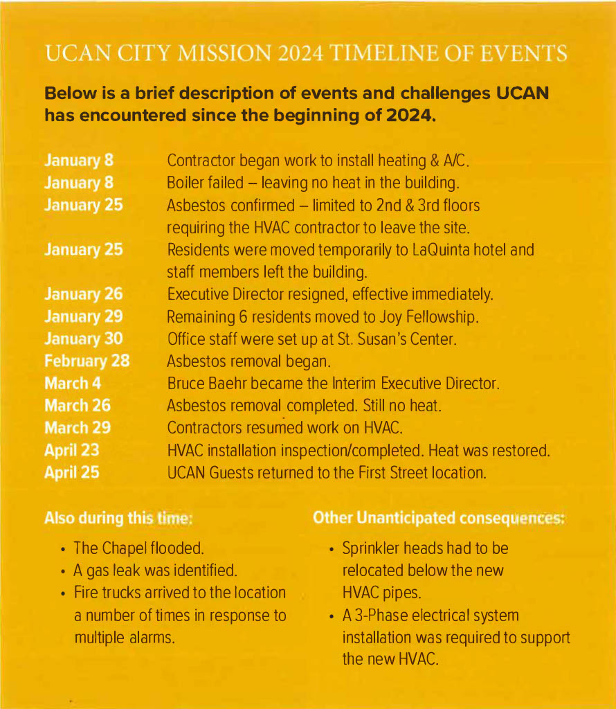 7 months have flown by and here we are. UCAN has been both challenging and rewarding. Early on I had shared in our spring report that I began my journey with UCAN working in three specific areas. I continue to travel that path; learning and becoming acclimated to the mission, improving its efficiency and effectiveness and being a serving presence. Learning is a constant process. Everyday at UCAN is full of new opportunities to learn and grow. This is because the mission is always in motion towards a better future. Allow me to share with you a few areas where I have been working: